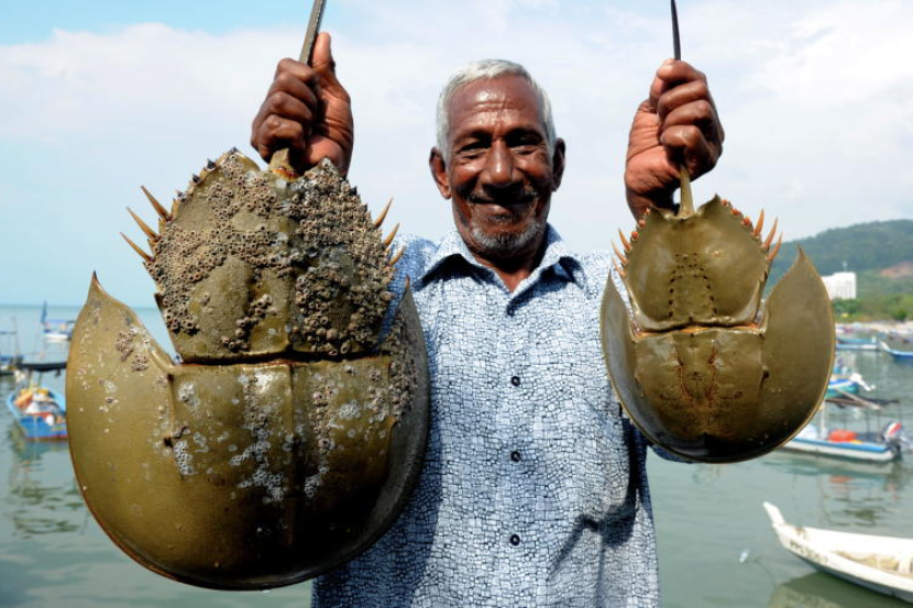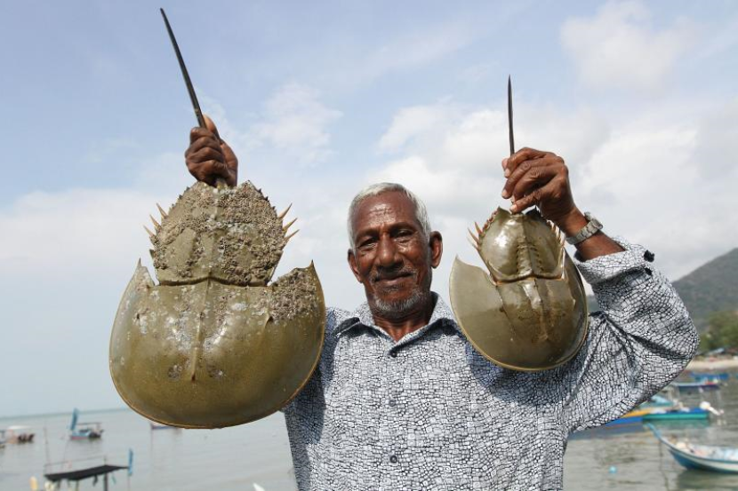 Seorang nelayan Syed Alaudin Kasim, 67, menunjukkan perbezaan antara belangkas gergasi yang dijumpai dengan belangkas biasa di jeti nelayan Teluk Bahang, Pualau Pinang.