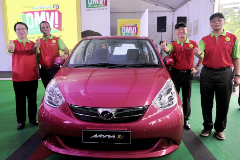 Presiden yang juga Ketua Pegawai Eksekutif Perodua, Datuk Aminar Rashid Salleh (kanan) bersama Presiden Perodua Auto Corporation, Yasumitsu Morita menunjukkan model terbaru Myvi XT di majlis pelancaran kereta tersebut di Universiti Malaya, Kuala Lumpur pada Khamis. - foto RICKY LAI/The Star