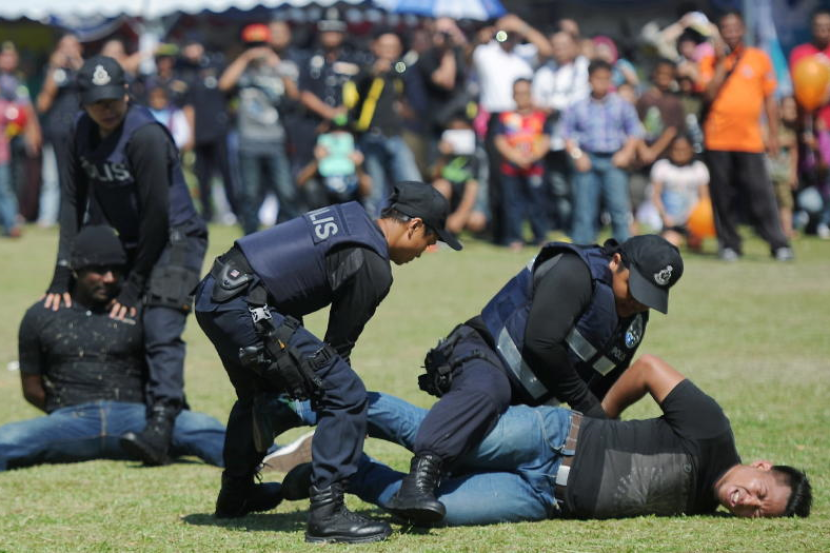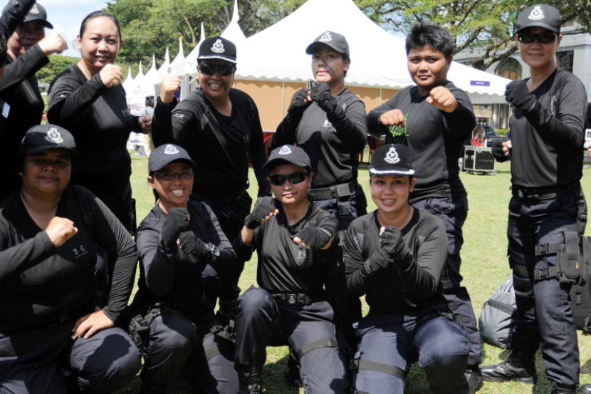 Anggota pasukan Ops Cantas Wanita Polis Diraja Malaysia (PDRM) Sarawak ketika melakukan demonstrasi cegah jenayah pada Hari Terbuka Pasukan Gerakan Udara PDRM sempena Peringatan Hari Polis Ke-207 di Padang Merdeka, Kuching pada Ahad. - fotoBERNAMA