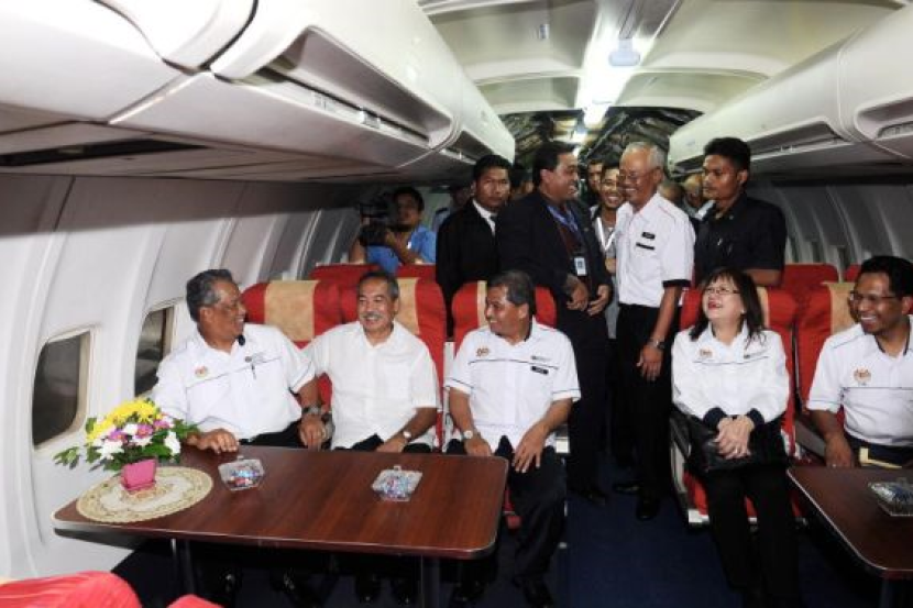 Timbalan Perdana Menteri Tan Sri Muhyiddin Yassin (duduk, kiri) beramah mesra bersama Pengerusi Malaysia Airlines Tan Sri Md Nor Yusof (dua, kiri) dan Ketua Pengarah Jabatan Pengajian Politeknik Kementerian Pendidikan Malaysia Datuk Mohlis Jaafar (tiga, kiri) semasa berada di dalam kapal terbang Boeing 737 - 400. Foto BERNAMA