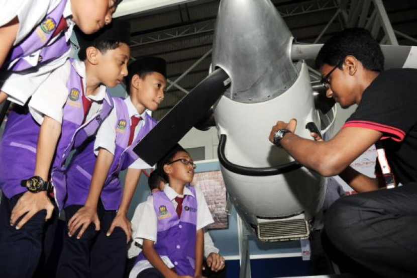 Murid-murid Sekolah Kebangsaan Kebun Bunga Telok Panglima Garang diberi penerangan oleh pelajar Diploma Penyelengaraan Pesawat, Arravindran Thirunavukarasu semasa menghadiri majlis penyerahan pesawat terpakai kepada Kementerian Pendidikan daripada Malaysia Airlines di Politeknik Banting di Kuala Langat, Isnin. Foto BERNAMA