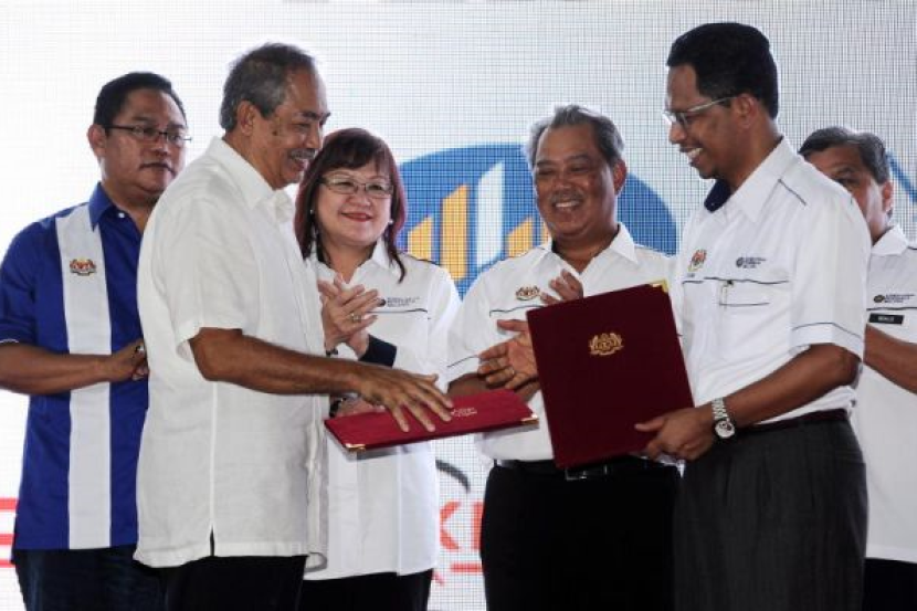 Timbalan Perdana Menteri, Tan Sri Muhyiddin Yassin menyaksikan pertukaran dokumen di antara Pengerusi Malaysia Airlines Tan Sri Md Nor Yusof (kiri) dan Ketua Setiausaha Kementerian Pendidikan Datuk Zaini Ujang (kanan) semasa Majlis Penyerahan Pesawat terpakai kepada Kementerian Pendidikan oleh Malaysia Airlines di Politeknik Banting di Kuala Langat, Isnin. Foto BERNAMA