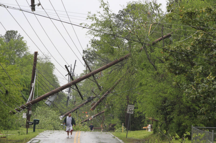 Seorang lelaki berjalan di Jackson Street sambil melihat banyak tiang eletrik yang tumbang akibat ribut tornado di Tupelo, Miss. Foto AP