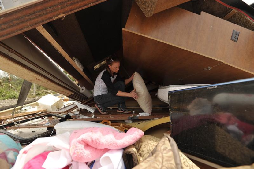 Seorang wanita sedang mencari barang-barang yang masih boleh digunakan di sebalik runtuhan rumahnya akibat ribut tornado di Mayflower, Arkansas. Foto EPA