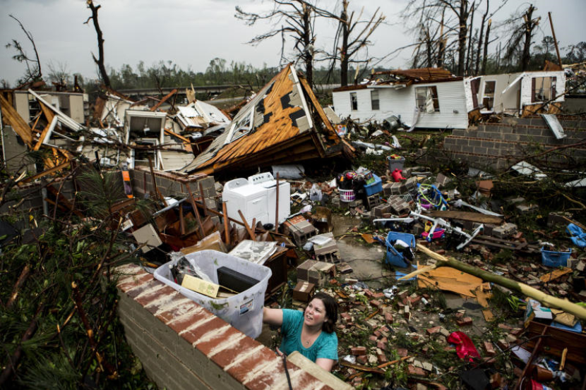 Seorang penduduk, Jodi Walls mengemaskan beberapa barang di dalam sebuah kotak dari kawasan rumahnya selepas ribut tornado melanda kejiranan itu Clayton Ave di Tupelo, Miss. Foto AP