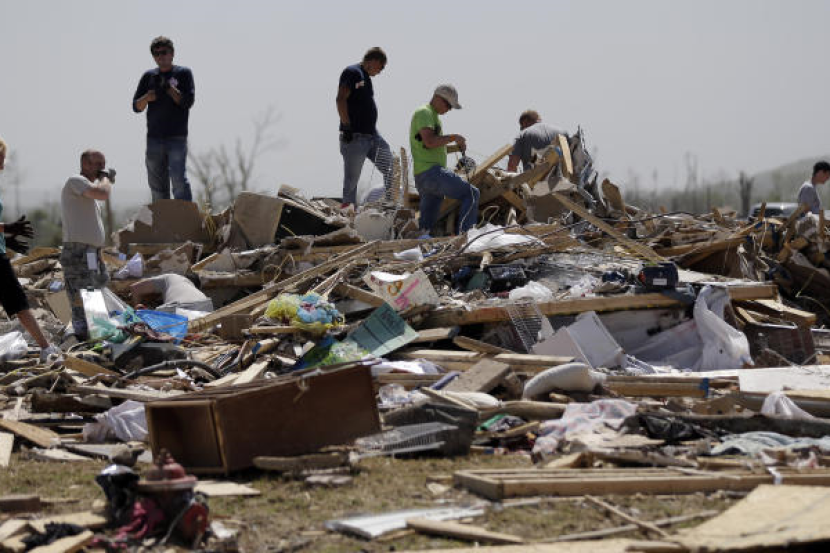 Sekumpulan penduduk berada di atas timbunan serpihan bangunan dan rumah yang musnah akibat ribut tornado di Vilonia, Ark. Foto AP