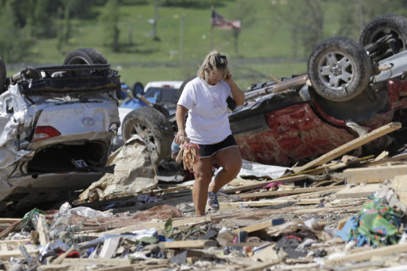 Seorang penduduk, Connie Krehel melihat serpihan-serpihan rumahnya yang musnah akibat ribut tornado di Vilonia, Ark. Foto AP