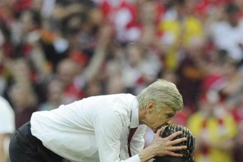 Wenger mencium dahi pemainnya Bacary Sagna selepas sah bergelar juara.