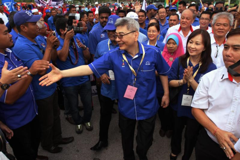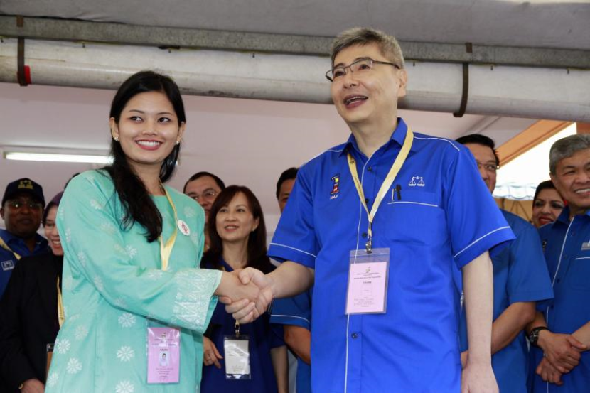 Calon BN, Datuk Mah Siew Keong bersalaman dengan penyokong parti itu.