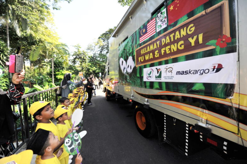 Kanak-kanak beratur di sepanjang jalan di Zoo Negara bagi menyambut ketibaan Fu Wa (panda jantan) dan Feng Yi (panda betina) yang tiba di Zoo Negara di sini, hari ini.