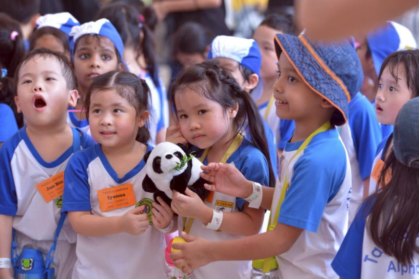 Kanak-kanak menyambut ketibaan Fu Wa (panda jantan) dan Feng Yi (panda betina) yang tiba di Zoo Negara di sini, hari ini.