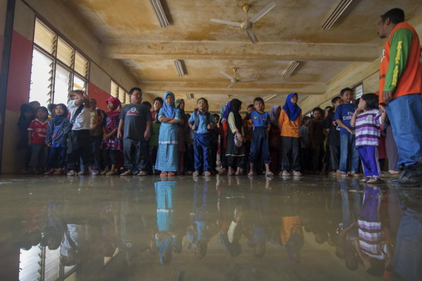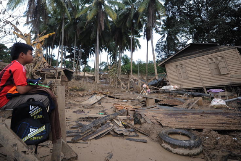 Murid tahun enam, Ahmad Affendi Ahmad Riduan,12, termenung di atas tangga selepas mempersiapkan beg dan pakaian biasa yang akan digunakan untuk hari pertama sekolah esok walaupun rumahnya telah rebah menyembah bumi selepas kampungnnya Kampung Buntut Pulau, Temerloh teruk dilanda banjir besar di sini, Ahad.