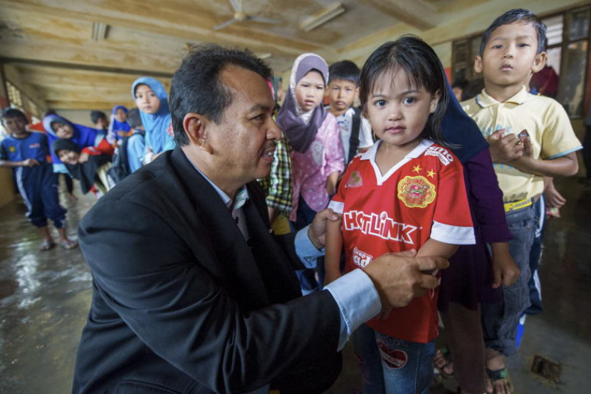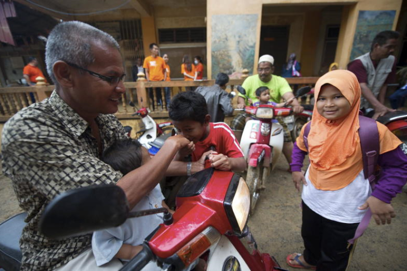 Abu Bakar Mat Said,57, menghantar anak Mohd Sulhi ,10, (tengah) dan anak saudaranya Ummi Ayuni Mohd Noor,9, (kanan) menghadiri hari pertama sesi persekolahan 2015 meskipun tidak berpakaian seragam sekolah, di Kuala Krai, Ahad.