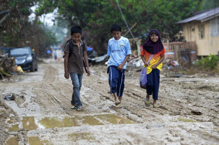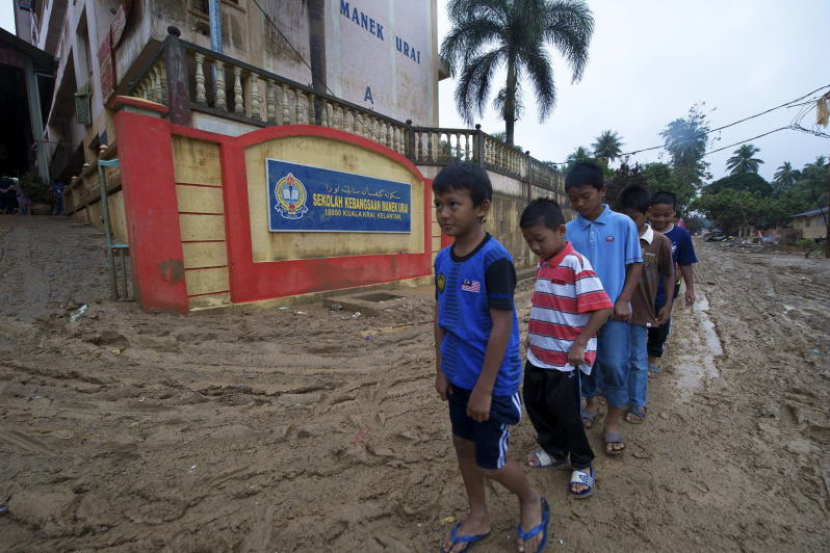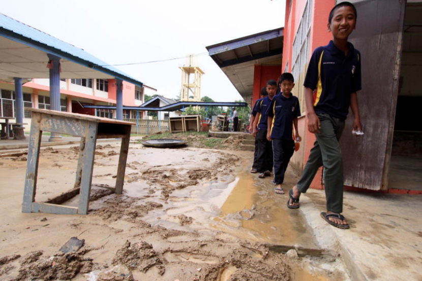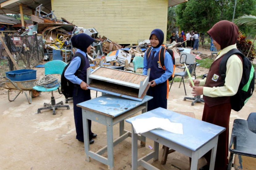 Beberapa pelajar Sekolah Kebangsaan Pasir Raja, Dungun mengangkat meja yang tidak sesuai digunakan ekoran rosak teruk akibat banjir sebelum memulakan sesi persekolahan tahun 2015 di sini, Ahad.