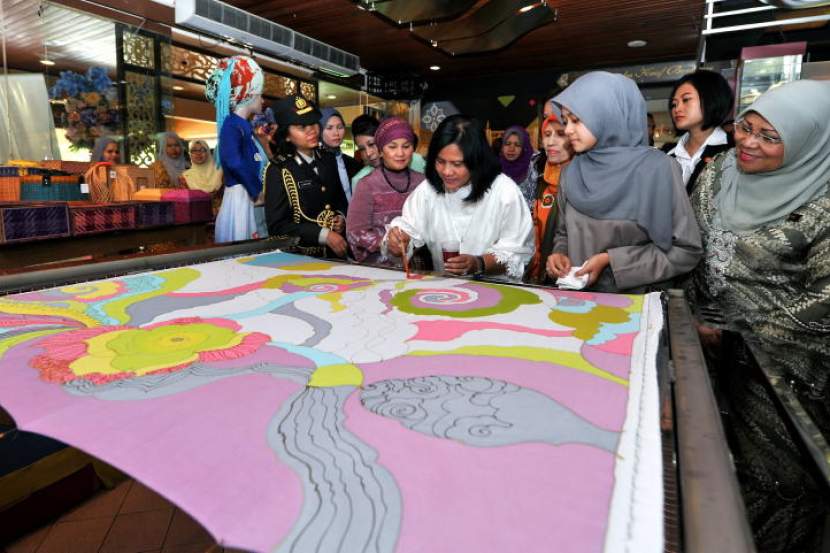 Isteri Presiden Indonesia Joko Widodo, Iriana, mencuba teknik mencanting batik semasa melawat ke Kompleks Kraf Kuala Lumpur di sini, hari ini. Turut kelihatan, Menteri Pembangunan Wanita, Keluarga dan Masyarakat, Datuk Seri Rohani Abdul Karim (kanan)