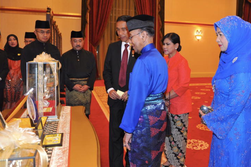 Yang di-Pertuan Agong, Tuanku Abdul Halim Mu'adzam Shah dan Raja Permaisuri Agong, Tuanku Hajah Haminah berkenan melihat cenderahati bersama Presiden Indonesia, Joko Widodo dan isteri, Ibu Iriana Joko Widodo pada Majlis Mengadap dan Santapan sempena lawatan rasmi Presiden Indonesia ke Malaysia di Istana Negara.