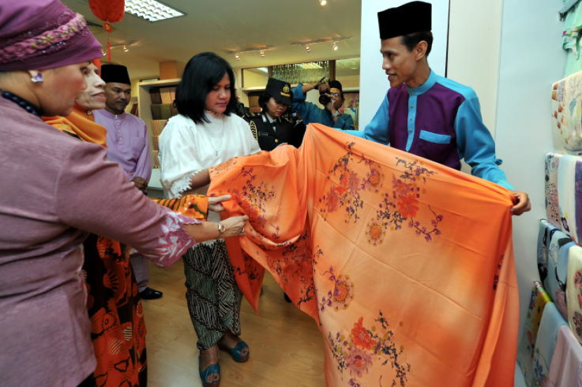 Isteri Presiden Indonesia, Ibu Iriana Joko Widodo melihat kain batik semasa melawat Kompleks Kraf Kuala Lumpur.