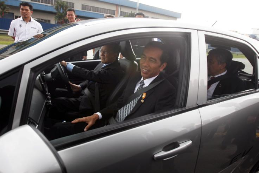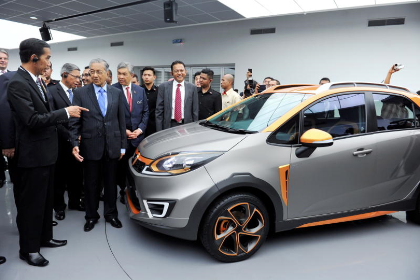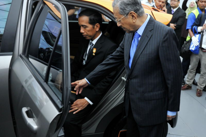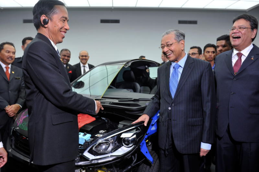 Presiden Indonesia Joko Widodo dan bekas Perdana Menteri, Tun Dr Mahathir Mohamad ketika melihat prototype kereta Proton Iriz di Pusat Penyelidikan dan Pembangunan Proton pada lawatan Pusat Kecemerlangan Proton.
