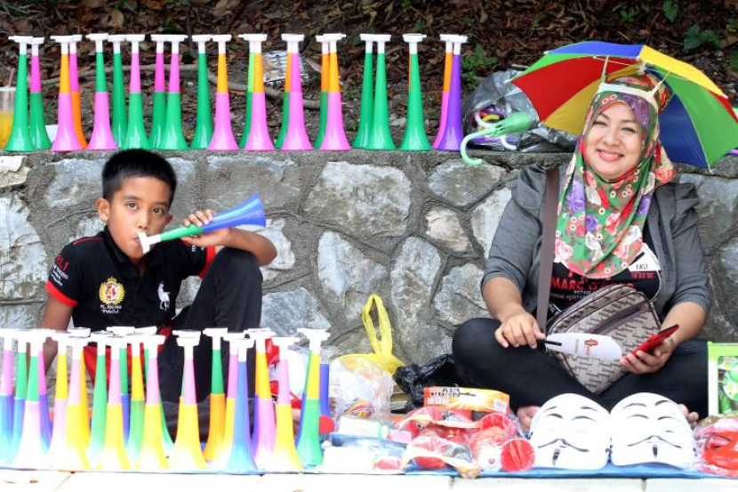Peniaga mengambil kesempatan menjual vuvuzela kepada peserta perhimpunan Baju Merah di ibu negara.
