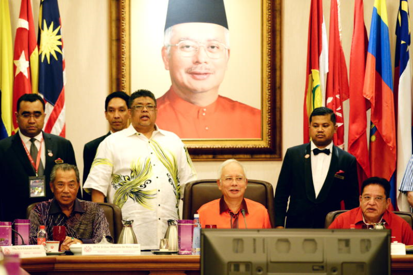 Presiden UMNO Datuk Seri Najib Tun Razak (tengah) mempengerusikan mesyuarat Majlis Tertinggi UMNO di Menara Datuk Onn Rabu malam menjelang Perhimpunan Agung UMNO ke-69. Turut hadir Timbalan Presiden Tan Sri Muhyiddin Yassin (kiri) dan Setiausaha Agung UMNO, Datuk Seri Tengku Adnan Tengku Mansor (kanan).