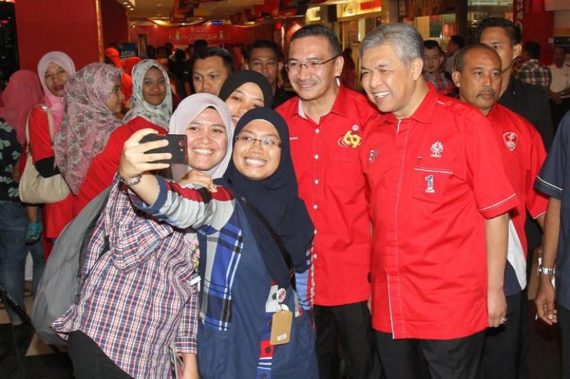 Datuk Seri Dr Ahmad Zahid Hamidi dan Datuk Seri Hishamuddin Tun Hussein melaungkan masa melayan pengunjung-pengunjung yang hadir pada Perhimpunan Agung Umno, di PWTC pada Rabu.