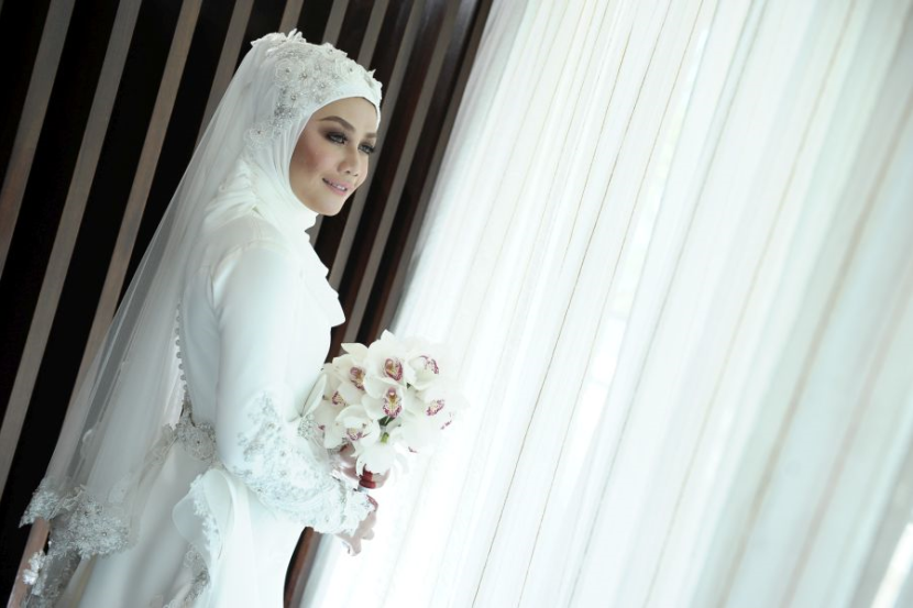 Stacy kelihatan cantik dengan busana putih gading pada majlis bersejarahnya bergelar isteri kepada Akim. FOTO: Astro.