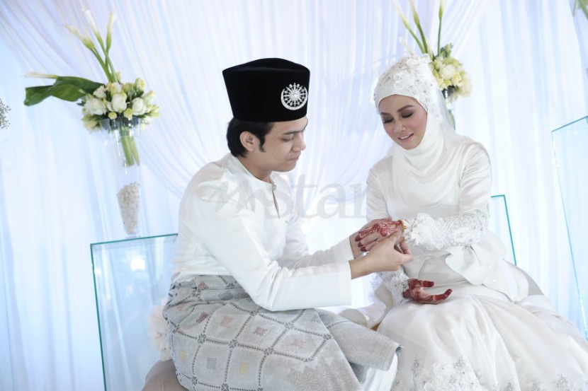 Akim menyarungkan cincin di jari manis Stacy selepas akad nikah. Majlis diadakan di Hotel Shangri-La, Kota Kinabalu Sabah pada 5 Februari 2016. Dengan dua kali lafaz, Akim sah bergelar suami kepada Stacy. FOTO: Astro