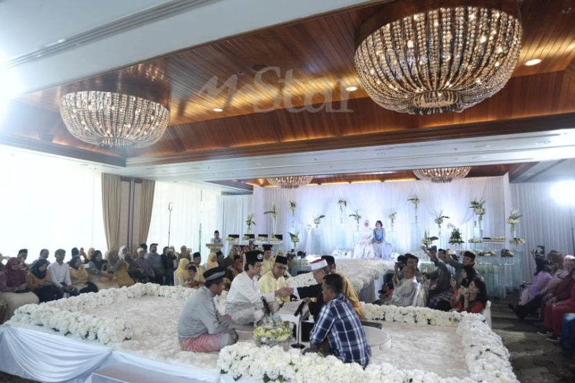 Pihak lelaki menyerahkan mas kahwin berjumlah RM300 kepada pengantin perempuan. Akim dan Stacy sah bernikah dengan dua kali lafaz dalam satu majlis di Hotel Shangri-La, Kota Kinabalu Sabah pada 5 Februari 2016. FOTO: Astro