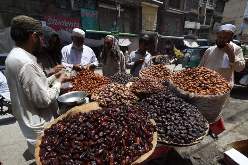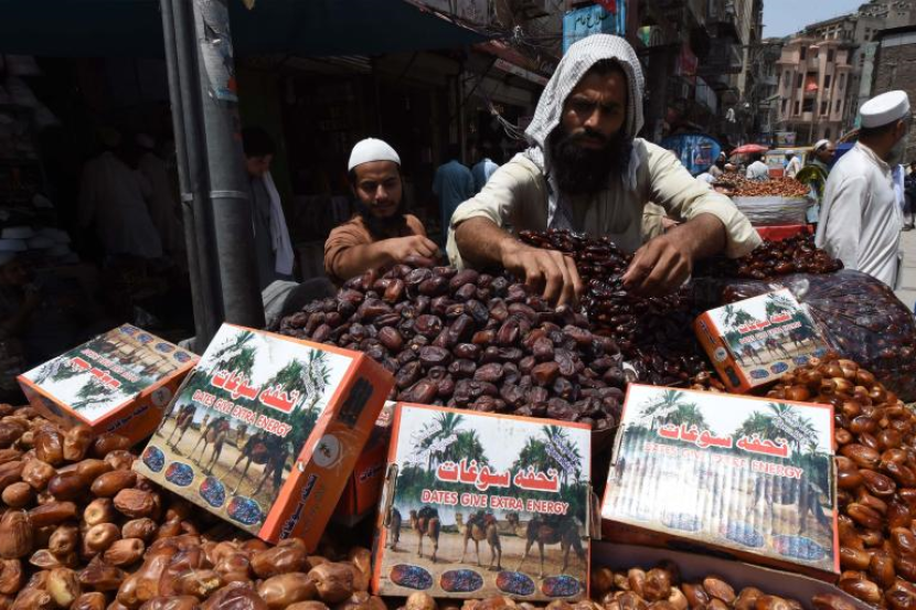Penjual di pasar Peshawar, Pakistan mengatur kurma untuk dijual sebagai persediaan umat Islam menyambut kedatangan Ramadan. AFP