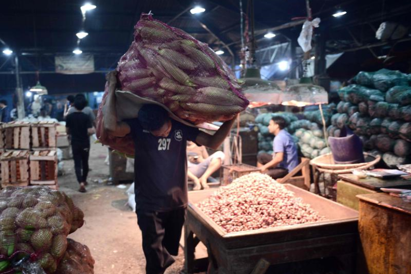Pekerja di pasar Tangerang, Jakarta sibuk menyediakan bahan mentah ketika umat Islam sedang membuat persediaan menyambut kedatangan Ramadan. AFP