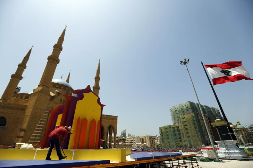 Para pekerja sibuk menyiapkan dekorasi di masjid Mohammed al-Amin, Lebanon sempena Ramadan. AFP