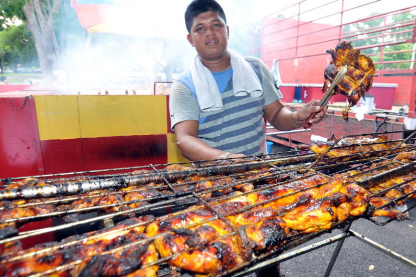 Seorang pekerja membakar ayam madu yang dijual sebagai juadah berbuka puasa di bazar Ramadan Bayan Baru, George Town. -fotoBERNAMA
