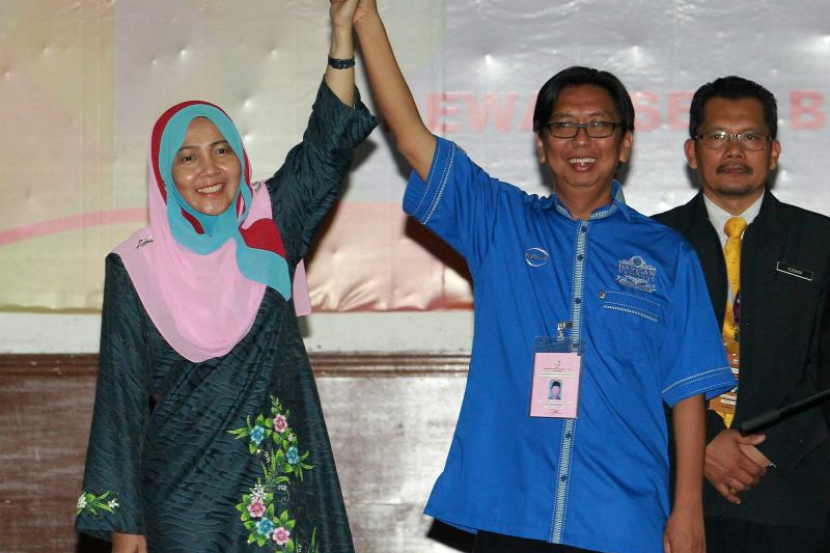 Budiman ditemani isteri, Norma Aida Abdullah ketika dipentas semasa pengumuman keputusan PRK Parlimen Sungai Besar, Sabtu.