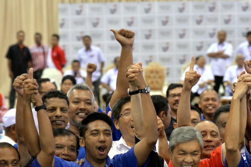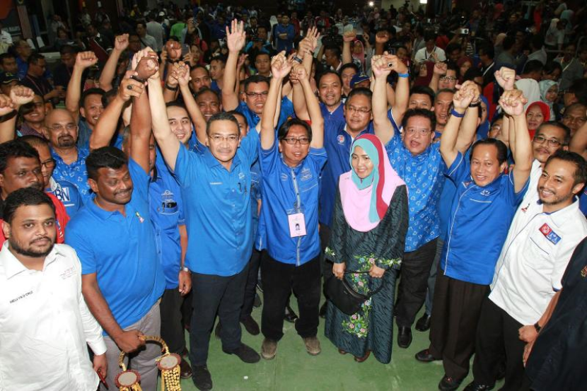 Calon BN, Budiman Mohd Zohdi diraikan pemimpin BN dan penyokong selepas diumumkan memenangi kerusi Parlimen Sungai Besar.