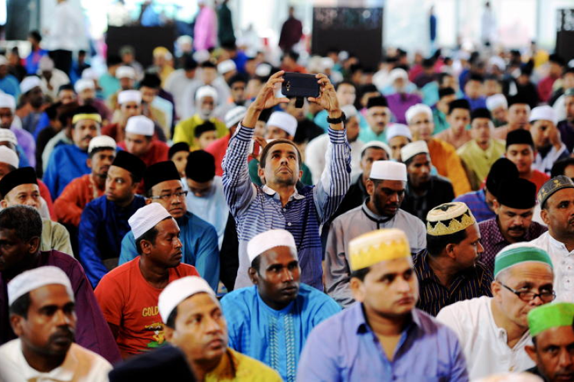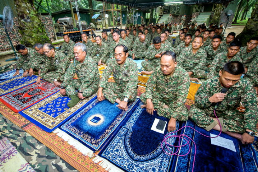 Panglima Angkatan Tentera Malaysia (ATM) Jeneral Tan Sri Zulkifeli Mohd Zin (tengah) bertakbir bersama anggota hadir menunaikan solat sunat Aidilfitri dan sumbangan raya di Pos Tok 'O Rantau Panjang, Rabu. Turut hadir Panglima Medan Barat Tentera Darat Leftenan Jeneral Datuk Seri Zulkiple Kasim (tiga,kanan)
