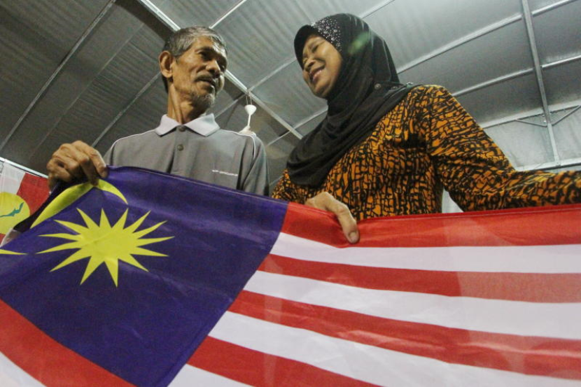 Bapa kepada atlet Paralimpik negara Abdul Latif Romly, Ramly Mat, 59 (kiri) dan ibunya Salmah Yatim, 58 (kanan) mengibarkan Jalur Gemilang selepas anak mereka meraih pingat emas dalam acara T20 Lompat Jauh pada Paralimpik Rio malam ini. -fotoBERNAMA