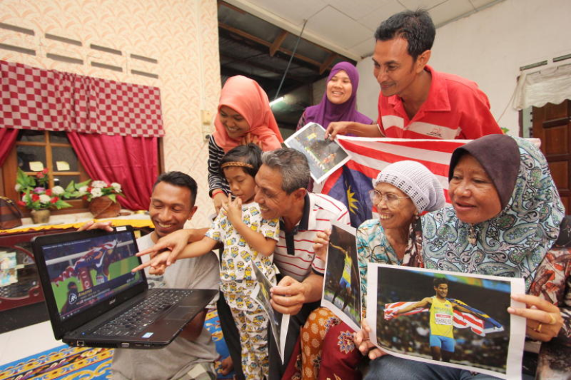 Bapa kepada atlet paralimpik negara Mohamad Ridzuan, Mohamad Puzi Mat Isa,56 (duduk,tiga, kanan) dan ibu, Laila Salleh,49 (kanan) bersama ahli keluarga menonton rakaman larian emas anaknya melalui youtube di kediamannya. -fotoBERNAMA