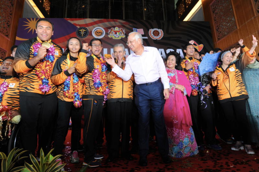 Perdana Menteri, Datuk Seri Najib Tun Razak dan isteri, Datin Seri Rosmah Mansor meraikan wira Emas Sukan Paralimpik Rio de Janeiro (dari kiri) Muhammad Ziyad Zolkefli, Siti Noor Radiah Ismail, Mohamad Ridzuan Mohamad Puzi dan Abdul Latif Romly di Kompleks Bunga Raya di Lapangan Terbang Antarabangsa Kuala Lumpur. Turut hadir bekas Perdana Menteri, Tun Abdullah Ahmad Badawi dan isteri, Tun Jeanne Abdullah yang merupakan Penaung Majlis Paralimpik Malaysia. Foto Bernama