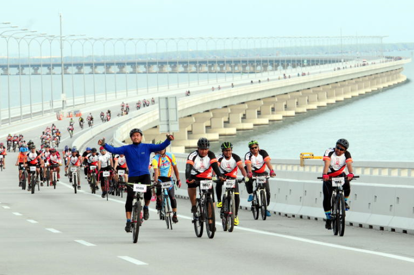 Seramai 3000 peserta dari seluruh Malaysia mengayuh basikal sejauh 30 kilometer di Jambatan Sultan Abdul Halim Muadzam Shah (JSAHMS) semasa menyertai Program Penang Bridge Challenge (PBC) sempena sambutan Hari Sukan Negara, Sabtu.