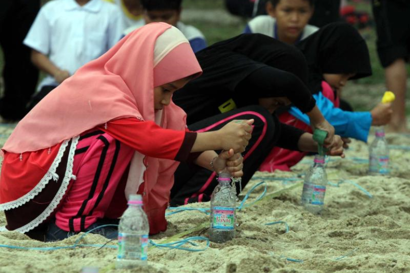 Kanak-kanak mengambil bahagian dalam sukaneka sempena Hari Sukan Negara 2016 di Pantai Batu Buruk.