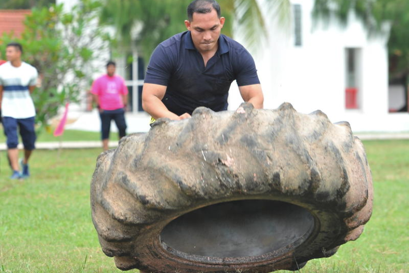 Hanek Mohd Hamzah Ismail berusaha untuk menggolek tayar gergasi sewaktu menyertai acara Strong Challenge Man sempena Hari Sukan Negara di Batu Burok, Sabtu.
