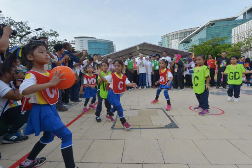Kanak-kanak menyertai pertandingan bola jaring pada sambutan Hari Sukan Negara 2016 di Presint 2, Putrajaya, Sabtu.