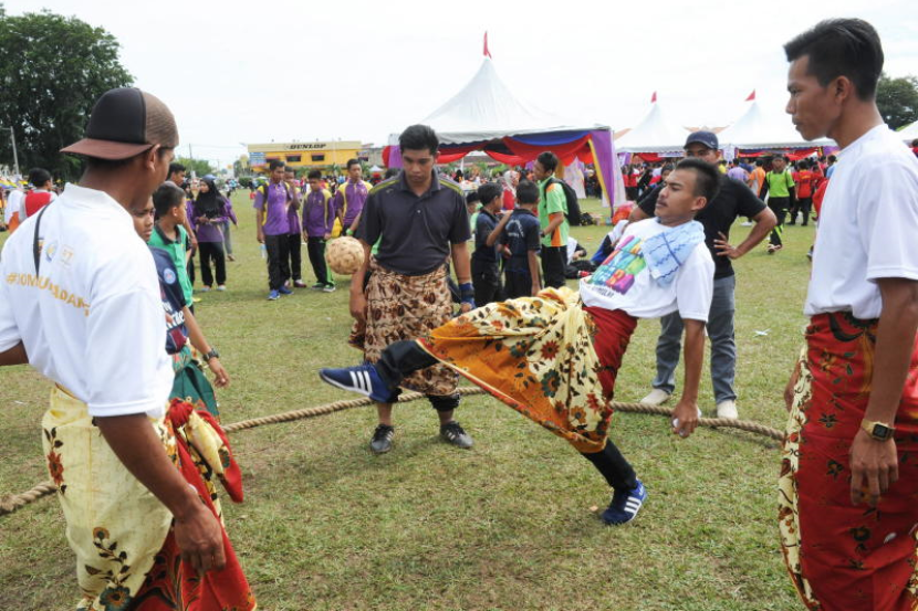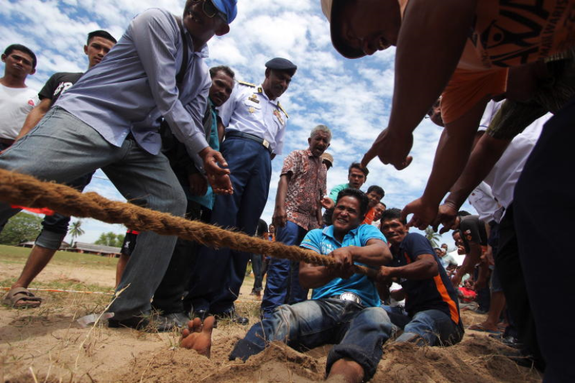 Pengarah Maritim Wilayah Timur Laksamana Pertama Maritim Datuk Mamu Said Alee (tiga, kiri) menyaksikan acara tarik tali yang disertai penduduk dan anggota Agensi Penguatkuasaan Maritim Malaysia (APMM) sempena Hari Sukan Negara 2016 pada Program Sahabat Maritim APMM Bersama Warga Kampung Nenasi Pantai, Sabtu.