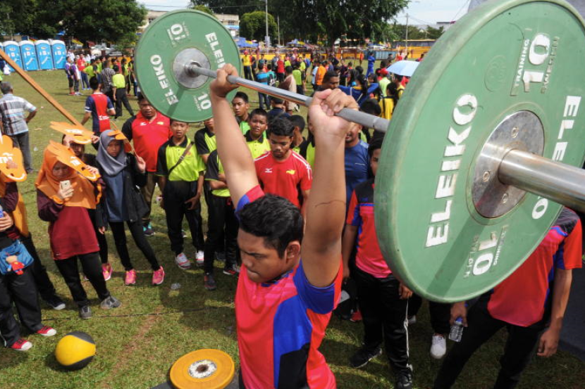 Pelajar tingkatan dua Sekolah Menengah Kebangsaan Pendita Zaaba, Alif Shahmi Mohd Nor mencuba sukan angkat berat sempena sambutan Hari Sukan Negara 2016 peringkat negeri di padang Sekolah Menengah Kebangsaan Dato' Mohd Taha,Gemencheh.