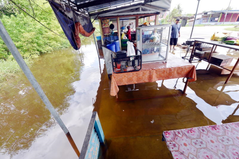 Peniaga makanan Abd Aziz Mat Said dan isteri Sofiah Mat Saad membersihkan kedai mereka setelah dimasuki air akibat fenomena air pasang besar yang melanda Kampung Menteri di Jalan Kuala Sepetang, Matang, Taiping Perak - FOTO: BERNAMA