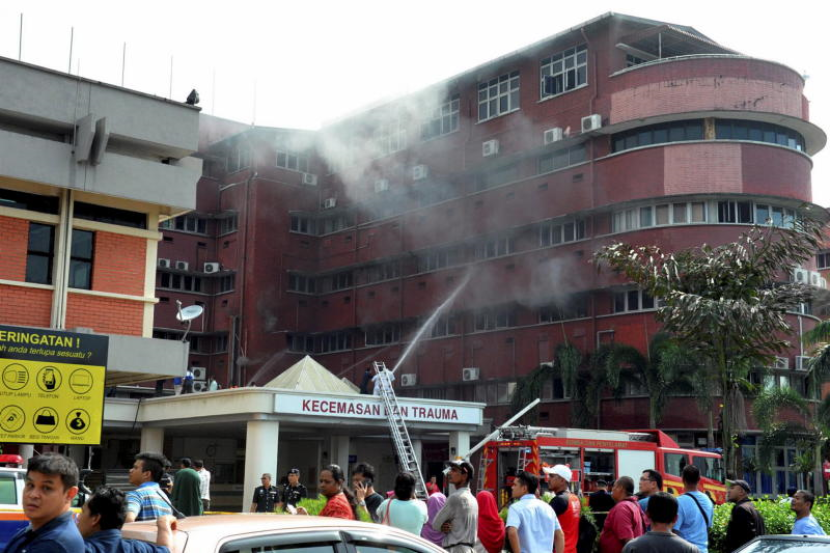 Kelihatan asap yang keluar dari satu bahagian di Hospital Sultanah Aminah, Johor Baru dalam kebakaran yang berlaku di Unit Rawatan Rapi (ICU) pada Selasa, 25 Oktober 2016. FOTO: ABDUL RAHMAN EMBONG