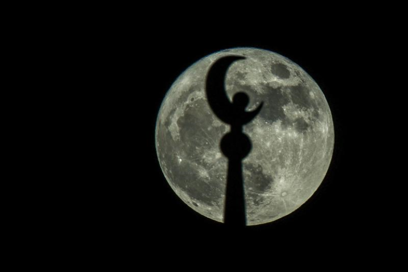 FENOMENA supermoon membayangi menara sebuah masjid di Kuwait City, Kuwait pada 14 November 2016. - EPA