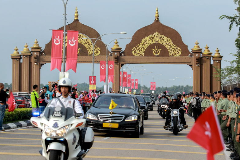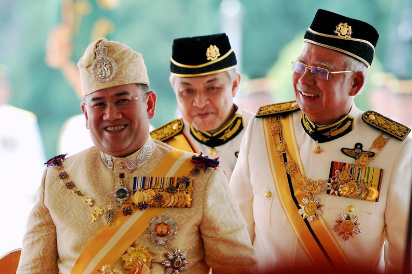 Sultan Muhammad V diiringi Perdana Menteri Datuk Seri Najib Tun Razak (kanan) dan Timbalan Perdana Menteri Datuk Seri Dr Ahmad Zahid Hamidi pada Istiadat Sambutan Rasmi Yang di-Pertuan Agong ke-15 di Dataran Parlimen.