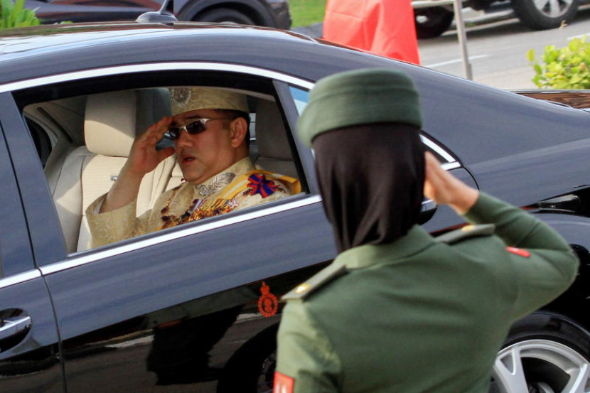 Sultan Muhammad V berkenan memberi tabik hormat kepada pegawai dan anggota tentera semasa keberangkatan baginda menuju ke Lapangan Terbang Sultan Ismail Petra, Pengkalan Chepa.