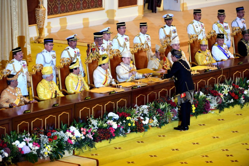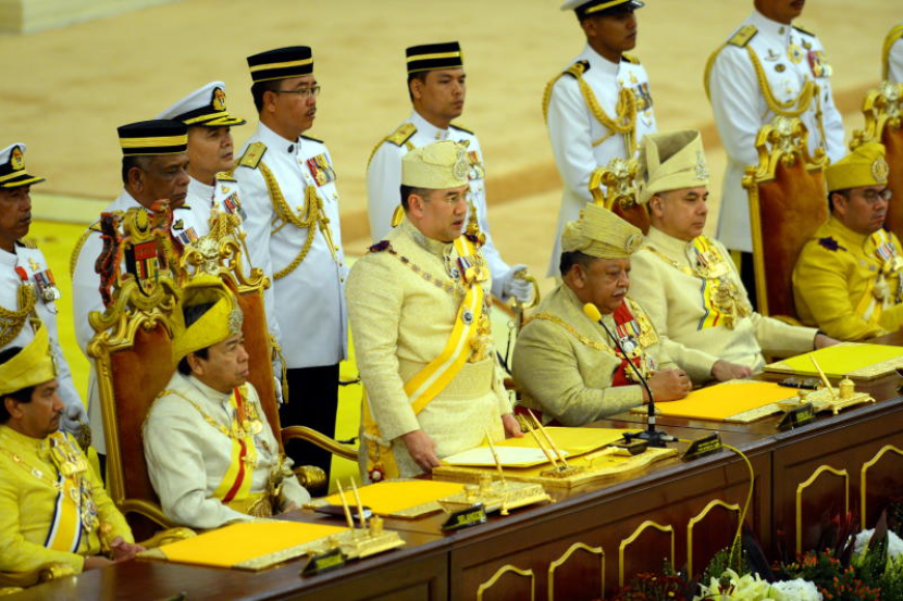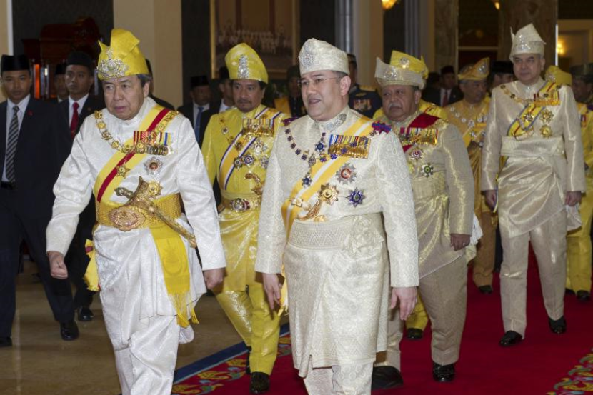 Sultan Selangor Sultan Sharafuddin Idris Shah (depan, kiri) diiringi Sultan Muhammad V (depan, kanan) berkenan hadir bagi mempengerusikan Mesyuarat Majlis Raja-Raja Ke-244 (Khas) sempena Istiadat Melafaz Sumpah dan Menandatangani Surat Sumpah Jawatan Yang di-Pertuan Agong ke-15 dan Timbalan Yang di-Pertuan Agong di Istana Negara. Turut berangkat (dari, kanan) Sultan Perak Sultan Nazrin Shah, Raja Perlis Tuanku Syed Sirajuddin Tuanku Syed Putra Jamalullail, Sultan Terengganu Sultan Mizan Zainal Abidin.